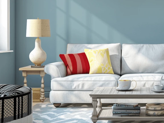 Uzupełnienie dla Corsici będą stanowić meble i dodatki w barwach cytrynowej żółci i jasnej (ale nie intensywnej) czerwieni. W tych kolorach może być utrzymana rama łóżka czy nocna szafka, ale też pościel, poduszki czy lampy. Nie chodzi rzecz jasna o to, aby cały wystrój był żółto-czerwony, a jedynie o kilka wyrazistych akcentów barwnych.