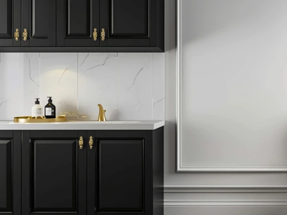 Duet czerni i bieli to połączenie, któremu nie jest potrzebny w zasadzie żaden rodzaj uzupełnienia. Możesz jednak wybrać kilka eleganckich złotych dodatków, takich jak wazon z suszonymi trawami – dzięki temu wnętrze łazienki nie będzie wyglądało tak ascetycznie.