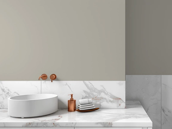 W tego rodzaju aranżacji łazienki doskonale sprawdzi się Cotton, jeden z flagowych odcieni z nowej palety Flügger. Ten stonowany beż będzie pasował do białych płytek o wzorze przypominającym marmur. O kilka tonów ciemniejszymi, „marmurowymi” płytkami możesz też obłożyć blat podtrzymujący umywalkę. Kompozycję uzupełni biała armatura łazienkowa i kabina prysznicowa z przezroczystego szkła. Decydując się na jedynie kilka skromnych dodatków, na przykład miedziane tacki na kosmetyki, sprawisz że łazienka nabierze szyku i będzie prezentować się doskonale.