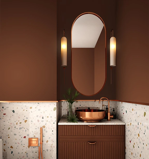 Jeśli chcesz czuć się komfortowo i intymnie w swojej łazience to jest to Twój kolor! Terakota przez wiele lat niedoceniania i zapomniana dziś wraca do mody z wielkim przytupem. Dodaj do swojego wnętrza nieco urozmaicenia i otul je ciepłym kolorem. Dzięki intensywnej barwie terakoty świetnie komponują się z nią chłodne odcienie takie jak czernie, szarości, granaty. A jeśli lubisz odważne połączenia, dodaj jaśniejsze odcienie ulubionego koloru np. miętowy.