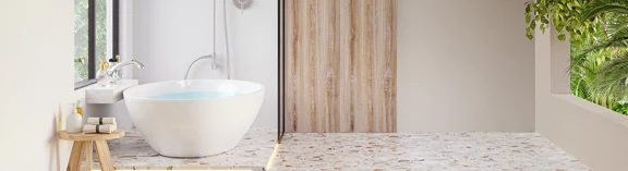 Łazienka inspirowana naturą to łazienka w stylu domowego spa. W tym stylu barwy ziemi oraz jasne błękity będą stanowić przeważające kolory. Projektując swój wymarzony pokój kąpielowy, zainspiruj się takimi kolorami jak: beże, brązy, błękity, szarości, odcienie jasnej zieleni oraz przybrudzone biele. Kolor natury wzbudza w nas poczucie wolności, radości i odprężenia, a jasne błękity i szarości wpływają na zwiększenie naszego poczucia bezpieczeństwa, pomagają się zrelaksować oraz wyciszyć. Wybierając kolor niebieski jako motyw przewodni – pamiętaj, że nie może to być zbyt ciemny odcień niebieskiego. Źle zastosowany ciemny kolor może wprowadzać nostalgiczny i smutny nastrój. Postaw na naturę jako akcent we wnętrzu. Możesz to osiągnąć drewnianymi dodatkami, płytkami drewnopodobnymi, wykończeniem blatów z naturalnych materiałów, wykorzystaniem kamienia jako materiał wykończeniowy lub wprowadzeniu licznej roślinności. Zainspiruj się również naturalnymi dodatkami takimi jak kosze wiklinowe, dywaniki jutowe czy rattanowe stoliczki. Oprócz odpowiedniej aranżacji, w łazience powinna panować również wyjątkowa atmosfera sprzyjająca relaksowi! W tym przypadku świetnym rozwiązaniem będą świece – oprócz pięknego zapachu, uzyskasz nastrojowe światło w całym pomieszczeniu. Jesteśmy pewni, że w takiej łazience poczujesz się jak w najdroższym SPA.