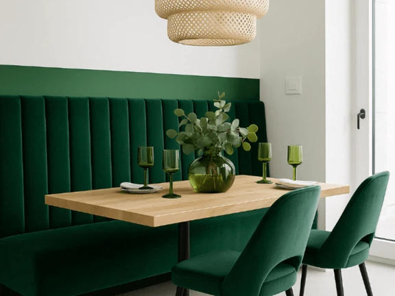 W salonie lub jadalni, gdzie zależy nam na wyrazistości i głębi, butelkowa zieleń będzie strzałem w dziesiątkę. Doskonale komponuje się z welurowymi tkaninami, bogatymi wzorami i stylizowanymi meblami, podkreślając charakter wnętrza.