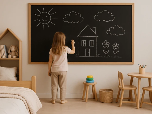 Dzieci uwielbiają rysować, pisać i tworzyć, a ściana pomalowana farbą tablicową to świetny sposób, by zapewnić im bezpieczną i twórczą przestrzeń do zabawy. W pokoju dziecka warto wydzielić fragment ściany lub nawet całą powierzchnię do rysowania kredą, a dla dodatkowego efektu można obramować taki fragment ramą drewnianą, nadając mu wygląd klasycznej tablicy szkolnej.